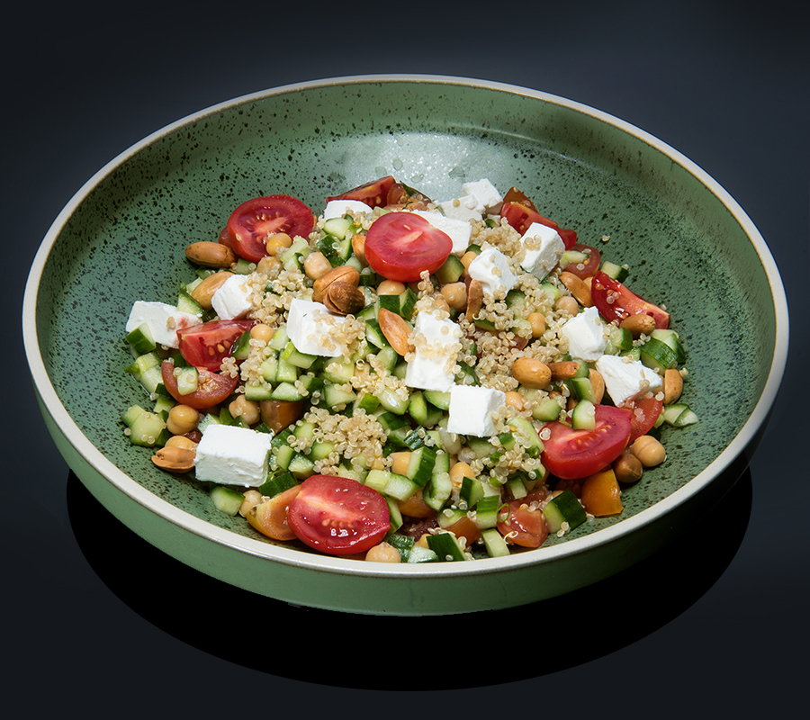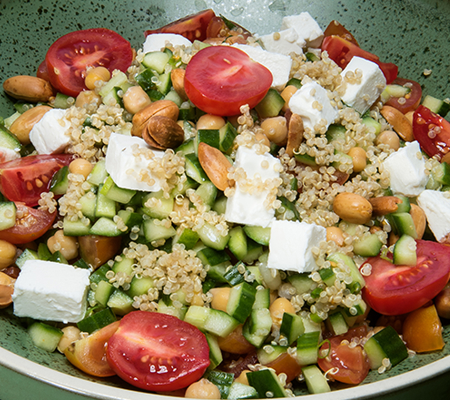 نموذج من اناء صحي ومقوي. تشكيلة من الحمص المطبوخ والخيار والطماطم والبصل والكينوا والفول السوداني بصلصلة الليمون وزيت الزيتون.